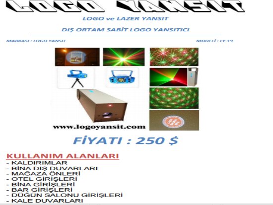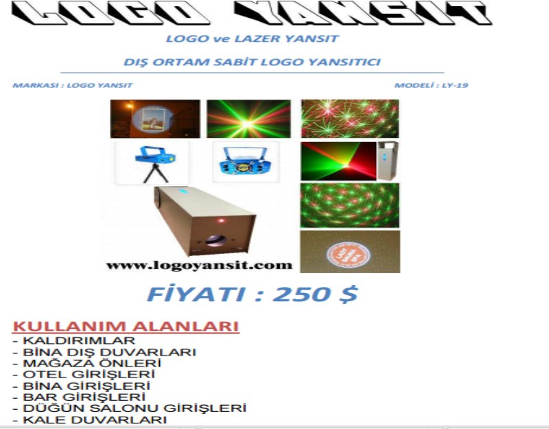Bu cihazın kullanımı Dış ortam olan yerler için uygundur. Cihaz yağmura, fırtınaya , kara , güneşe karşı dayanıklıdır. Cihazı mağazanızın ön giriş kapısının üstüne asarak kaldırıma veya yola logonuzun yansımasını sağlayabilirsiniz. Cihaz aynı zamanda lazer yansıtarak değişik efectlerle ortama renkli ışıklar saçar. Kaldırımdan geçen insanların logonuzu görmesini bu cihazla sağlayabilirsiniz. Logo yansıt dış ortam sabit olan cihazla uygun bir duvarınız varsa logonuzu duvara yansıtarak insanların karşıdan markanızı ,logonuzu , sattığınız şeyleri görmesini sağlayabilirsiniz. Cihazı uygun bir direğe asıp duvarınıza logo yansıtabilirsiniz. Firmamızdan Tripod ayak alıp cihazı onada monte edebilirsiniz. Logoları istediğiniz zaman değiştirebilirsiniz. Logolar renklidir. Orjinal halleriyle logoları yansıtabilirsiniz. Aşağıda bulunan uygulama videolarına göz atınız. Uygulama resimlerine bakınız. Cihazın kullanım videosunu izleyiniz. Kataloğunu indirip teknik özelliklerine bakabilirsiniz.