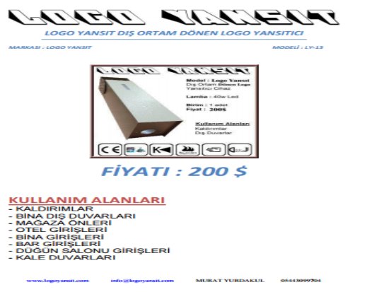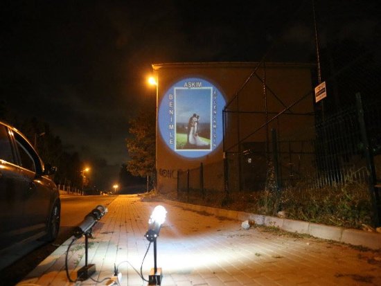 Bu cihaz 360 derece Dönen Logo Yansıtır. Kullanımı Dış ortam olan yerler için uygundur. Cihaz yağmura, fırtınaya , kara , güneşe karşı dayanıklıdır. Cihazı mağazanızın ön giriş kapısının üstüne asarak kaldırıma veya yola logonuzun yansımasını sağlayabilirsiniz. Kaldırımdan geçen insanların logonuzu görmesini bu cihazla sağlayabilirsiniz. Logo yansıt dış ortam sabit olan cihazla uygun bir duvarınız varsa logonuzu duvara yansıtarak insanların karşıdan markanızı ,logonuzu , sattığınız şeyleri görmesini sağlayabilirsiniz. Cihazı uygun bir direğe asıp duvarınıza logo yansıtabilirsiniz. Firmamızdan Tripod ayak alıp cihazı onada monte edebilirsiniz. Logoları istediğiniz zaman değiştirebilirsiniz. Logolar renklidir. Orjinal halleriyle logoları yansıtabilirsiniz. Aşağıda bulunan uygulama videolarına göz atınız. Uygulama resimlerine bakınız. Cihazın kullanım videosunu izleyiniz. Kataloğunu indirip teknik özelliklerine bakabilirsiniz.