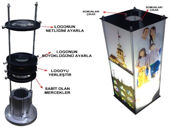 Bu cihazın kullanımı masa üstleri, sehpalar , komidinler ve tavana logo yansıtmak isteyip cihazı uygun yere koyabileceğiniz olan yerler için uygundur. İsterseniz evinizin yatak odasında tavana çocuğunuzun yada ailenizin fotoğrafını yansıtabilirsiniz. İsterseniz çocuk odanızda çocuğunuzun tavanı gördüğü yere kendi resimlerinizi yansıtabilir veya çocuğunuzun tavanda harfleri sayıları görmesini sağlayarak daha kolay öğrenmesini sağlayabilirsiniz. Sevgilinize Masa lambası olarak bu cihazı hediye edebilir ve çekindiğiniz fotoğrafların tavanda gözükmesini sağlayabilirsiniz. Logoları istediğiniz zaman değiştirebilirsiniz. Logolar renklidir. Orjinal halleriyle logoları yansıtabilirsiniz. Aşağıda bulunan uygulama videolarına göz atınız. Uygulama resimlerine bakınız. Cihazın kullanım videosunu izleyiniz. Kataloğunu indirip teknik özelliklerine bakabilirsiniz.