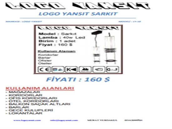 Bu cihazın kullanımı Tavan Sarkıtmalı olan yerler için uygundur. İsterseniz koridorlarınızda , isterseniz balkon saçak altlarınızda , isterseniz ofis tavan sarkıtmalarınızda , isterseniz otel lobilerinde , Tavandan sarkıtarak yere logo gelecek şekilde birçok seçenek olarak kullanıma uygun bir cihazdır. Mağazanızın içinde Yürüyüş koridorlarınızda Dikkat çekmek istediğiniz noktalarda yere Logo yansıyacak şekilde cihazı tavana monte edebilirsiniz. Logoları istediğiniz zaman değiştirebilirsiniz. Logolar renklidir. Orjinal halleriyle logoları yansıtabilirsiniz. Aşağıda bulunan uygulama videolarına göz atınız. Uygulama resimlerine bakınız. Cihazın kullanım videosunu izleyiniz. Kataloğunu indirip teknik özelliklerine bakabilirsiniz.